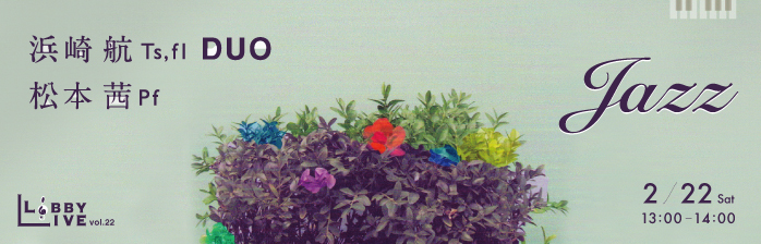 本年度3回目のロビーライブ vol.22は「Jazz」をテーマに、ゲストに浜崎航氏(テナーサックス、フルート) 松本茜氏(ピアノ)のお二人をお呼びします。若手ピアニストと実力派サクソフォニストによる名曲を散りばめたジャズの楽しさ溢れるデュオをお楽しみください。