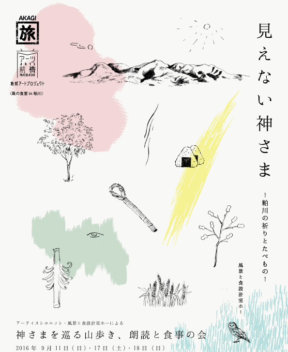風景と食設計室ホーは、2015年にアーツ前橋の地域アートプロジェクトとして赤城山南麓のほぼ中央に位置する前橋市粕川地区を調査していく中で、雄大な自然に囲まれたこの地域に今でも残る「粕流し」という行事や、さまざまな所に存在すると言われていた神さまを敬う行事とそのお供えものなどに興味を惹かれ、地元の方へのインタビューやフィールドワーク、文献調査などを行いました。